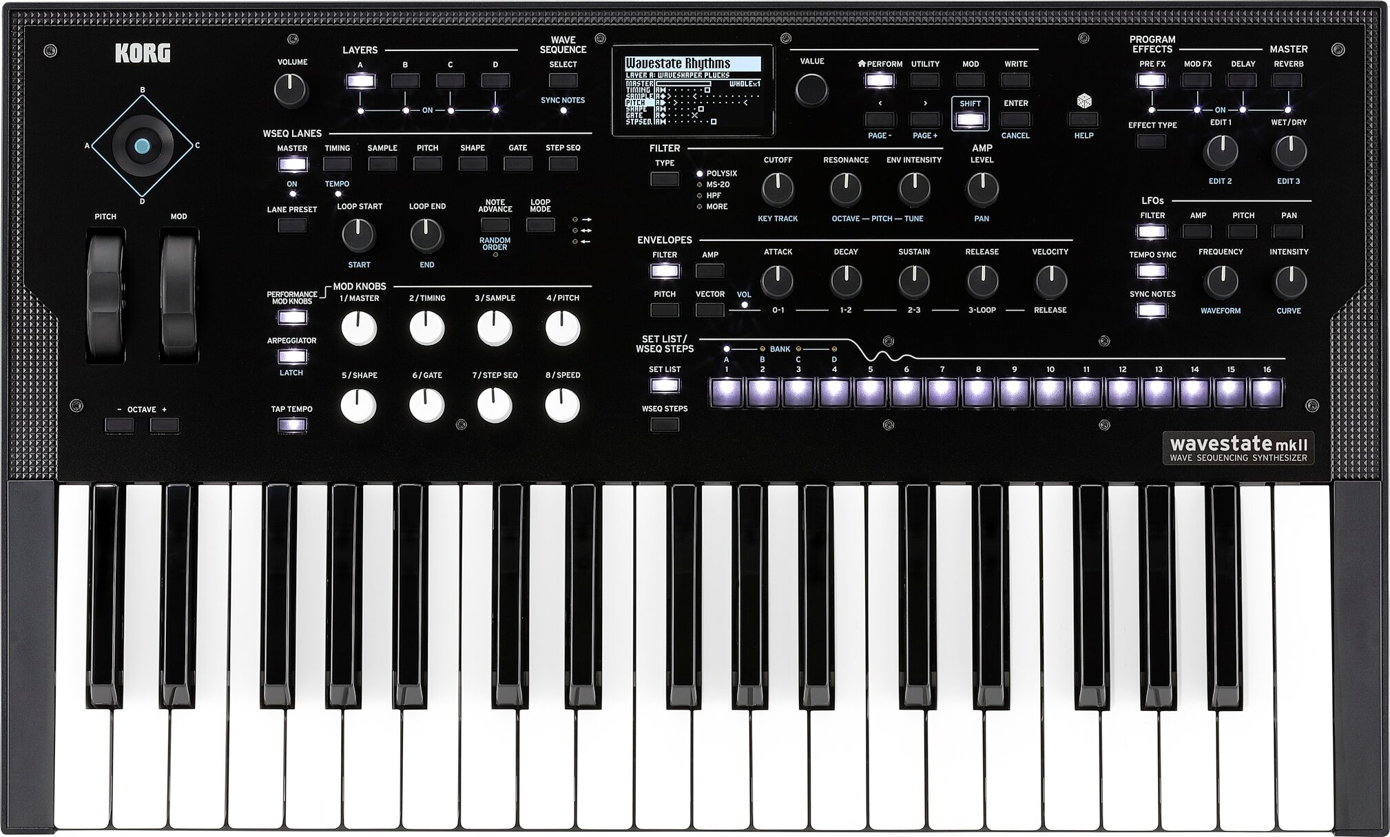 Bursting with knobs and controllers, the Wavestate invites you to explore. All of the basics-filter, envelopes, LFOs, effects-are at your fingertips with dedicated front-panel controls. Eight programmable