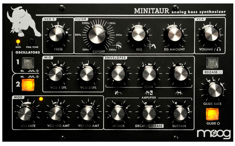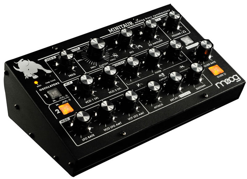 Moog Minitaur, monophonic Bass Synthesizer, One knob per function interface for tweaking and creating new sounds on the fly. It also makes live performance a blast.Two oscillators with Sawtooth (Original Taurus) and Square wave-shapes for each VCO.