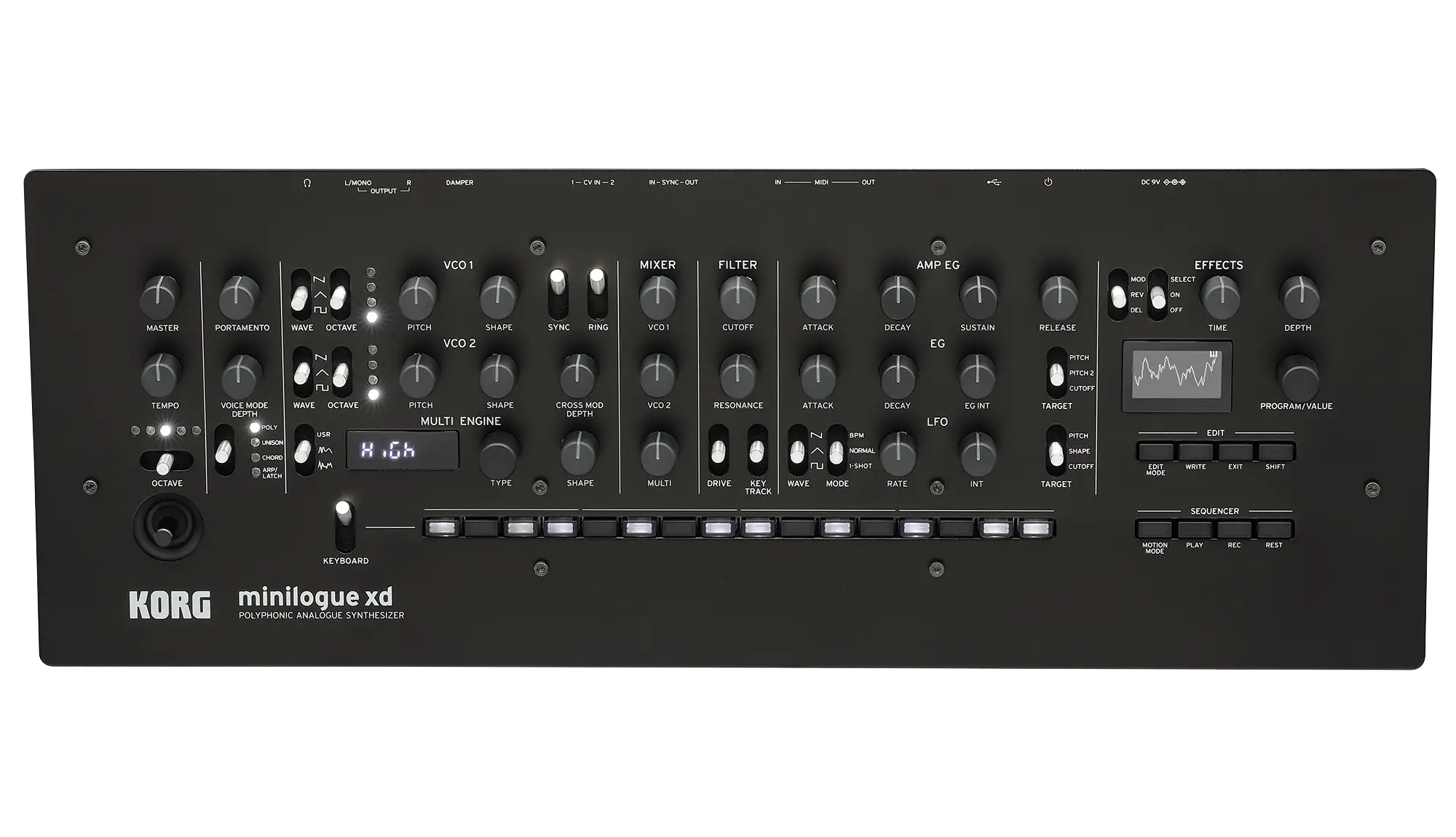 Voice structure of minilogue xd is 2VCO + MULTI ENGINE, 1VCF, 2EG, 1VCA, and 1LFO. In addition to the distinctive circuits found in the series, such as wave shaping to shape the overtones of the oscillator and a sync/ring switch, there's also cross modulation, a sharp two-pole filter, and a drive switch that adds thickness and drives signal into minilogue xd’s filter.