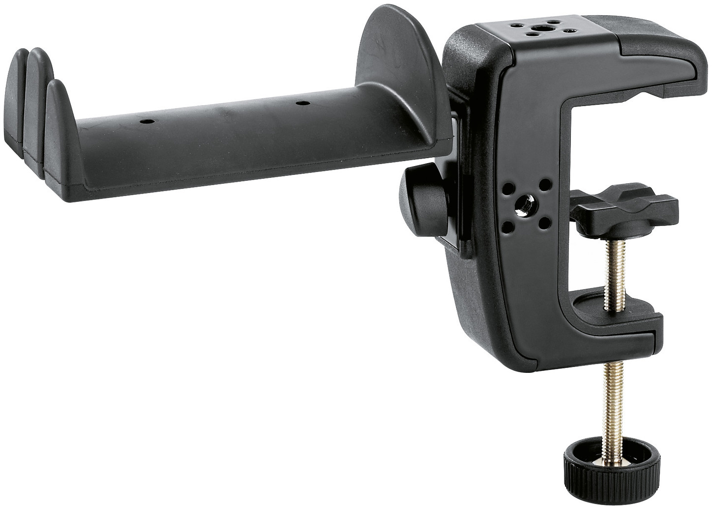 The headphone holder can be fixed in four different directions using the clamping screw. In addition the holder can be rotated from any position by 90°. The clamp can be extended from 0 to 1.889" allowing it to be mounted on a wide variety of tables. The stable metal construction with high quality plastic inserts guarantees a secure and strong attachment. The cleverly shaped clamping parts allow the clamp to be used on smooth surfaces and round-shaped tubes.