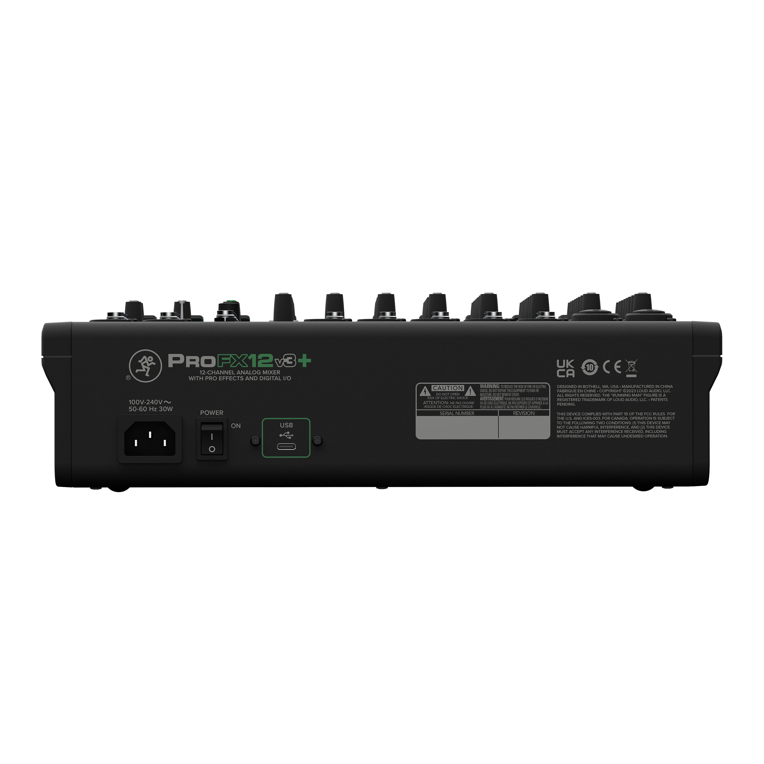 Mackie ProFX12v3+ is a professional analog mixer and USB-C audio interface with powerful enhancements for studio-quality recordings and live streams. Capture your performance with Onyx preamps and channel EQ, add computer audio via loopback, bring in calls via Bluetooth® and enhance your sound with upgraded GigFX+ effects on a color LCD screen.