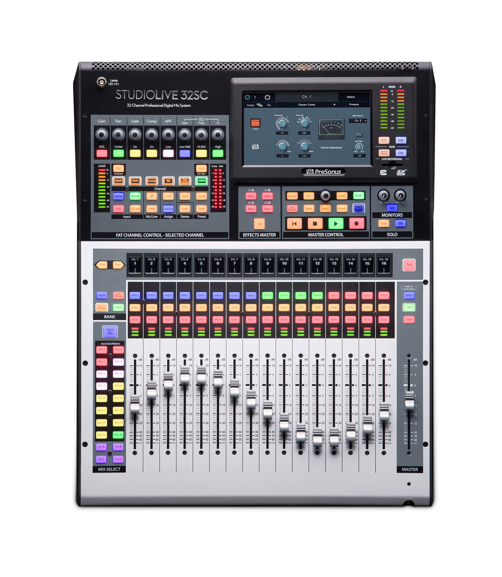 The StudioLive 32SC is a compact, rack-mountable 32-channel digital mixer that can be quickly and easily scaled for 16-, 24-, and 32-channel applications. Don't let the road-ready size fool you; the StudioLive 32SC sports a dual-core PreSonus FLEX DSP Engine powering 40 mixing channels, 26 mix buses, and 286 simultaneous processors—including 4 stereo reverberation systems and Fat Channel plug-in models on every input channel and mix bus.