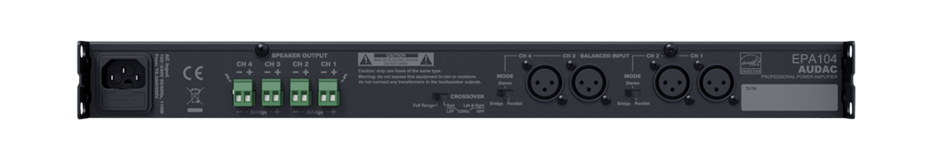 The quad channel construction consists of four channels with the possibility to use two independent stereos. In combination with the integrated active crossover network, it offers a complete solution for compact stereo applications with a bass cabinet. Various specific functions and advanced circuitry guarantees an optimal protection against DC malfunctioning, short circuit, overheating and overload. Signal input connections are integrated with balanced XLR connectors, and signal link through is possible using the XLR output connectors. Outputs are connected using terminal block connectors