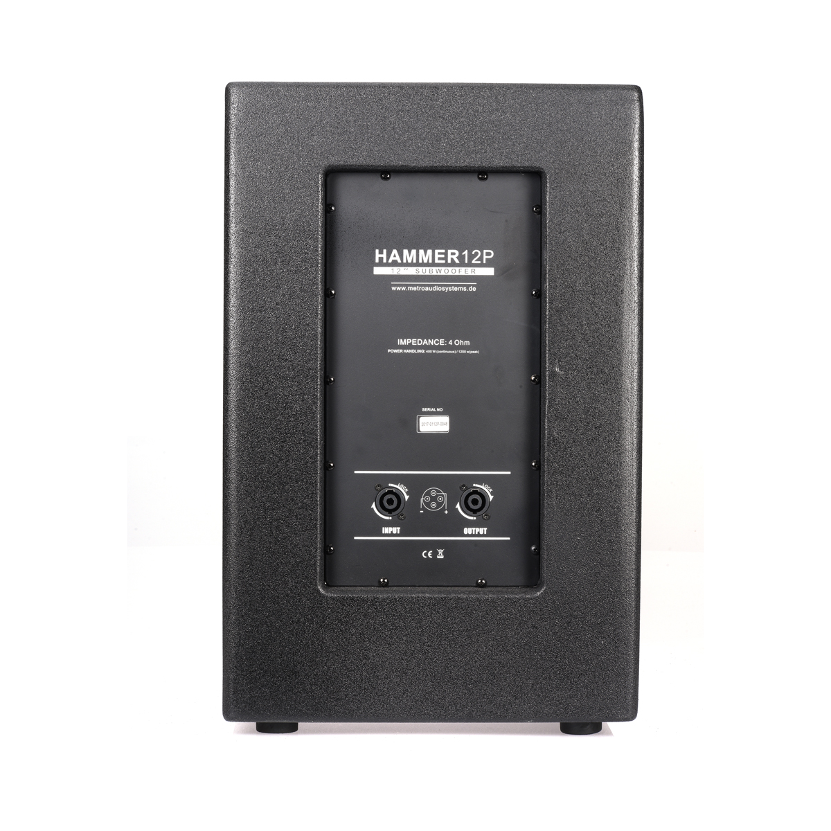Metro Audio Hammer-12P Professional passive subwoofer (without amplifier) ​​12" with power 400 W RMS / 1600 W Peak, frequency response 39 Hz - 120Hz(±10dB), 127dB max SPL(peak), sensitivity 96dB. Impedance: 4Ω. Has 2 NL4 inputs.