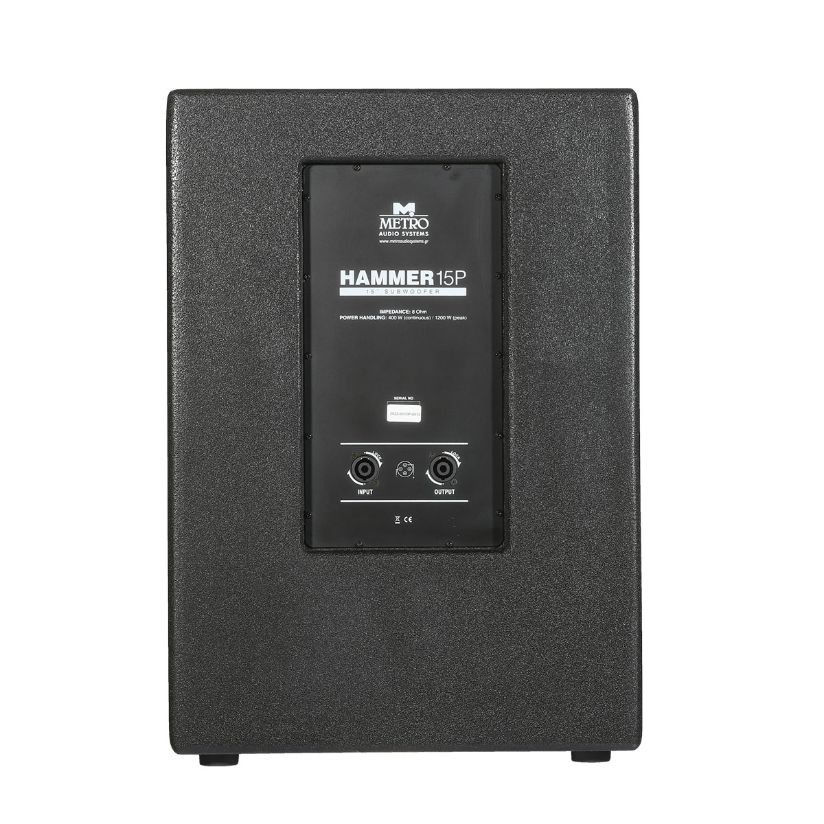 Metro Audio Systems Hammer-15P Professional passive subwoofer (without amplifier) ​​15" with power 450 W RMS / 1800 W Peak, frequency response 35 Hz - 200Hz(±10dB), 129dB max SPL(peak), sensitivity 97dB. Impedance: 8Ω. It has speakon inputs and outputs.
