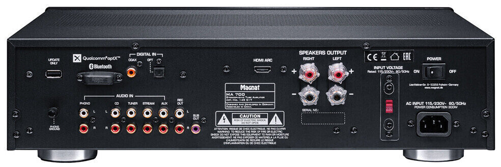 We are known for connecting things together and merging technologies. This is why our brand new MA 700 stereo amplifier offers the incomparable combination of tube technology for captivating sound and robust transistor power amplifiers, so that even larger speakers can be used without any problems. Beyond that, however, we have given the MA 700 everything it takes to be able to reproduce all your diverse media. In addition to all imaginable analogue and digital inputs as well as Bluetooth, this also includes an HDMI input. And that makes our amplifier a real all-rounder.