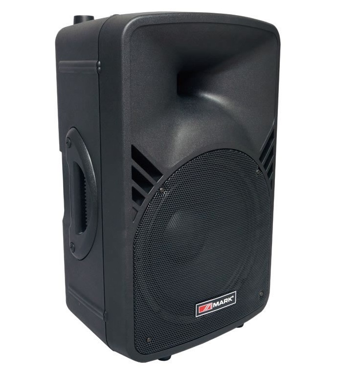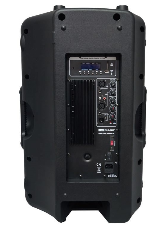 - Controls: EQ (Treble-Bass), Mic, Line, Main volume