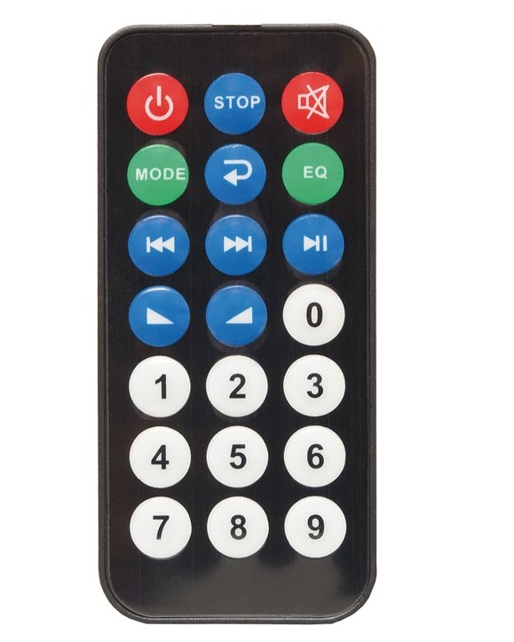 - Functions: MP3 player, LCD display, remote control, FM radio, Bluetooth, USB/SD