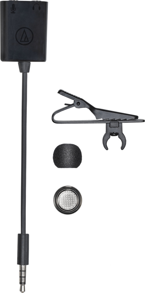 The ATR3350xiS includes a clothing clip, LR44 battery, foam windscreen, and a mic/headphone adapter for use with tablets, computers, and smartphones that accommodate a 3.5 mm (1/8") headset connection.