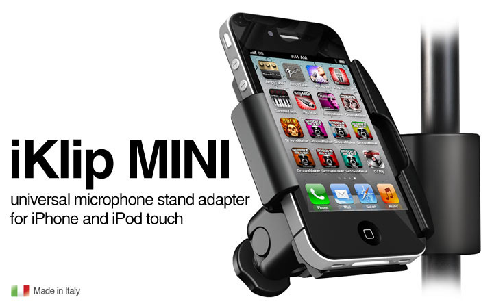 iKlip MINI is a universal microphone stand adapter for the iPhone® and iPod touch® to support your iOS device on stage, in the studio, at school or in the office. iKlip MINI securely supports your iPhone/iPod touch on any standard mic stand, pole or tripod (with diameters ranging from 11 - 20 mm /.43” - .79”) placed on the floor or tabletop.