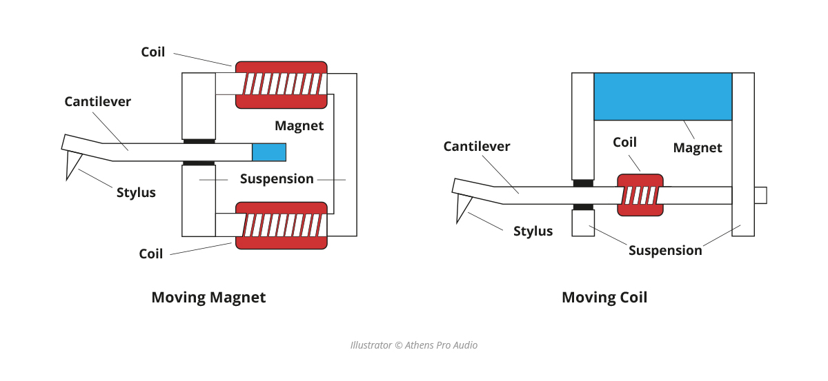 In a Moving Magnet (MM) cartridge, the movements generated by the stylus (needle) as it reads the grooves of the record are transferred via the cantilever. With the cantilever's movements controlled by an internal suspension system, a magnet is positioned at the end of the cantilever. As the stylus moves, so does the magnet. The movement of the magnet interacts with fine coils of wire placed nearby inside the cartridge, creating a voltage. This generates an electric current that is then transferred through the tonearm to the rest of the system via connected wires. This current is amplified and ultimately produces the sound output heard through your speakers. MM cartridges are generally more affordable and easier to maintain.