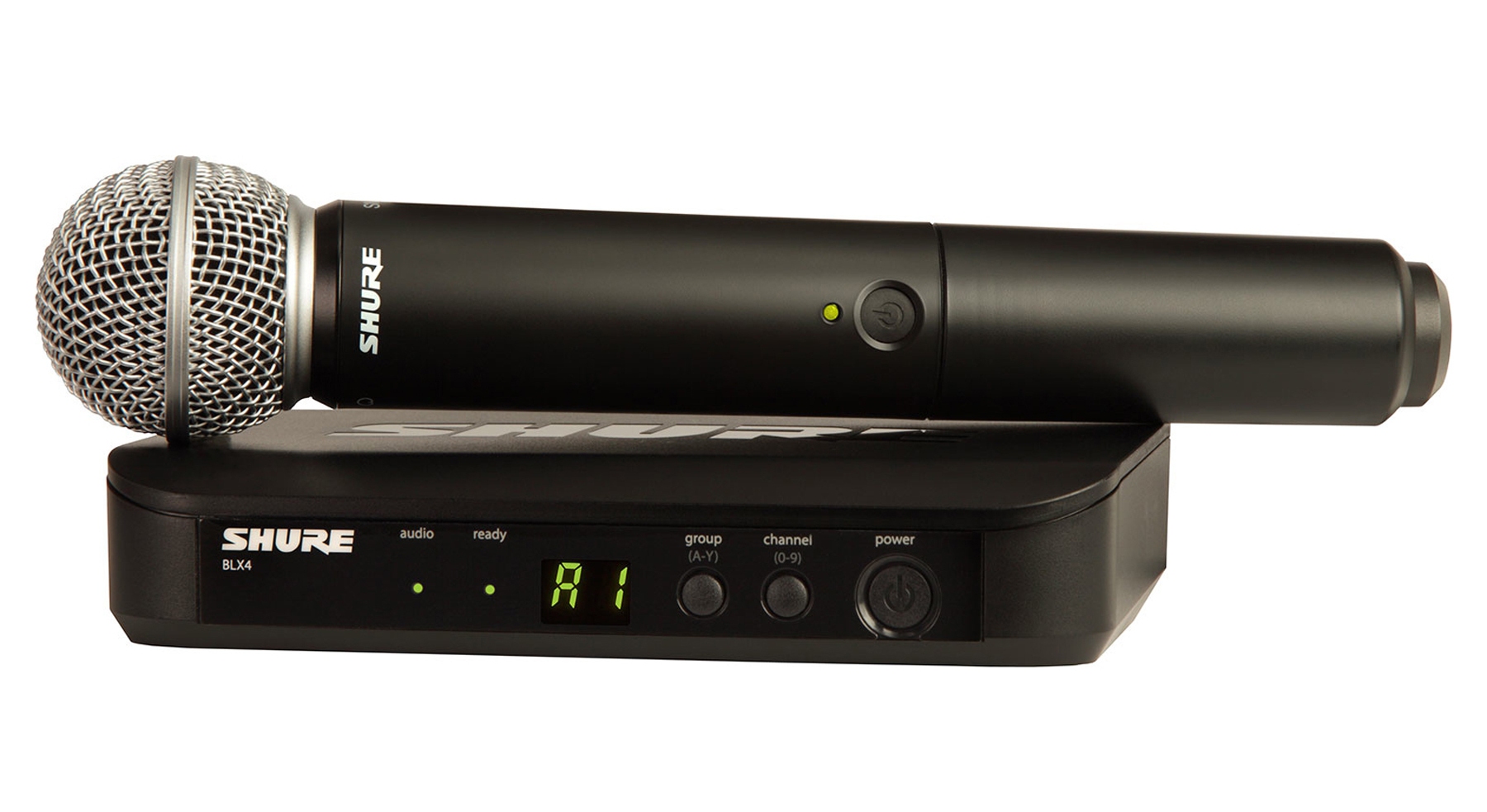 Includes BLX4 single-channel receiver, BLX2/SM58 handheld transmitter, microphone clip, power supply, 2 AA batteries, and user guide.
