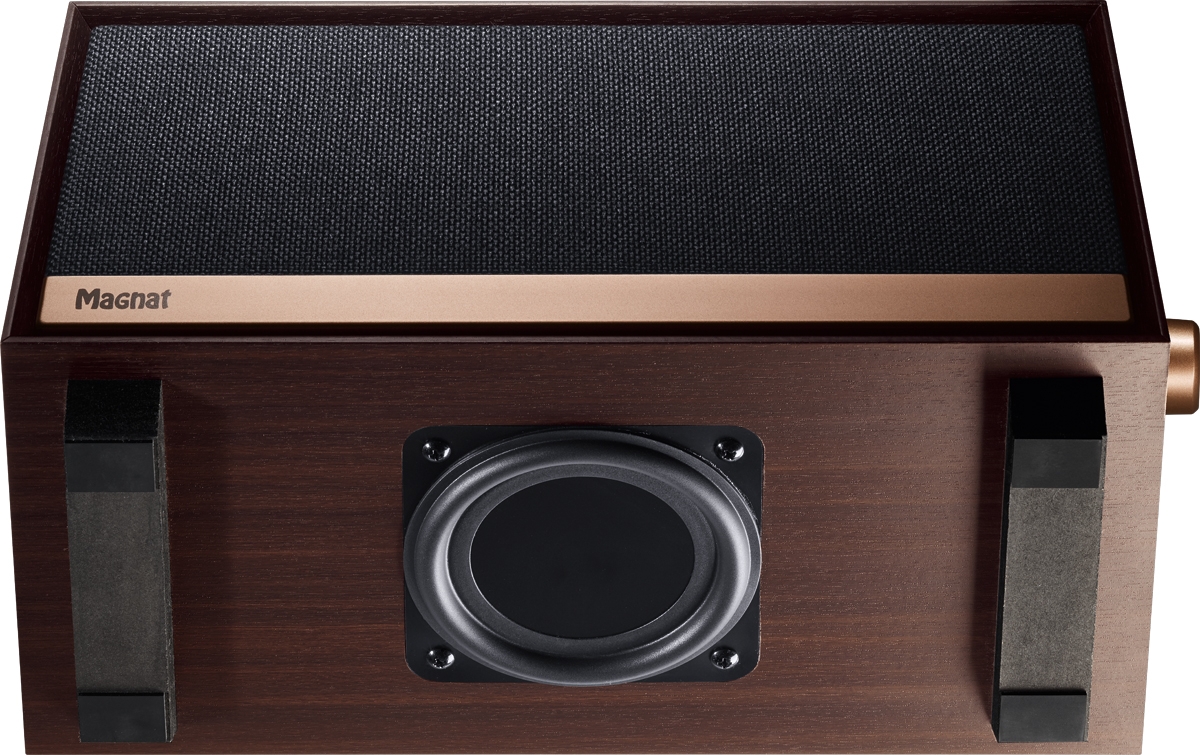 The Magnat Prime Classic offers pleasant and dynamic stereo sound from a compact wooden enclosure. The stereo speaker system concealed behind the fabric grille is supported by a powerful integrated subwoofer. The long-throw bass radiator is optimally positioned at the bottom and provides low bass support with absolutely no ambient noise. The result is a richly detailed stereo sound including low and powerful bass reproduction. The latest-generation integrated digital amplifier combines a total power output of 80 watts in three amplifier channels. State-of-the-art filtering and equalizing via DSP chip ensure the best possible sound.