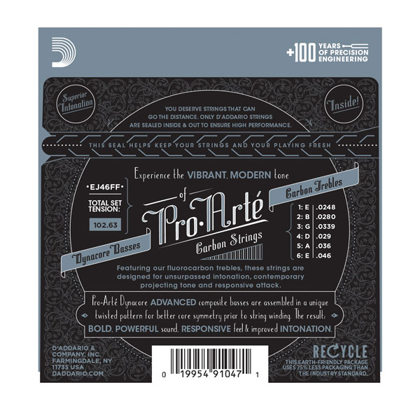 Experience the vibrant, projecting & contemporary tone of D’Addario’s Pro-Arté Carbon strings. Designed to the exacting specifications of our Pro-Arté nylon trebles, our fluorocarbon strings deliver unmatched superior intonation, a responsive attack and modern projecting tone. Paired with the bold and powerful Dynacore basses, Pro-Arté Carbons offer the ideal combination of tension and tone for today’s classical player.