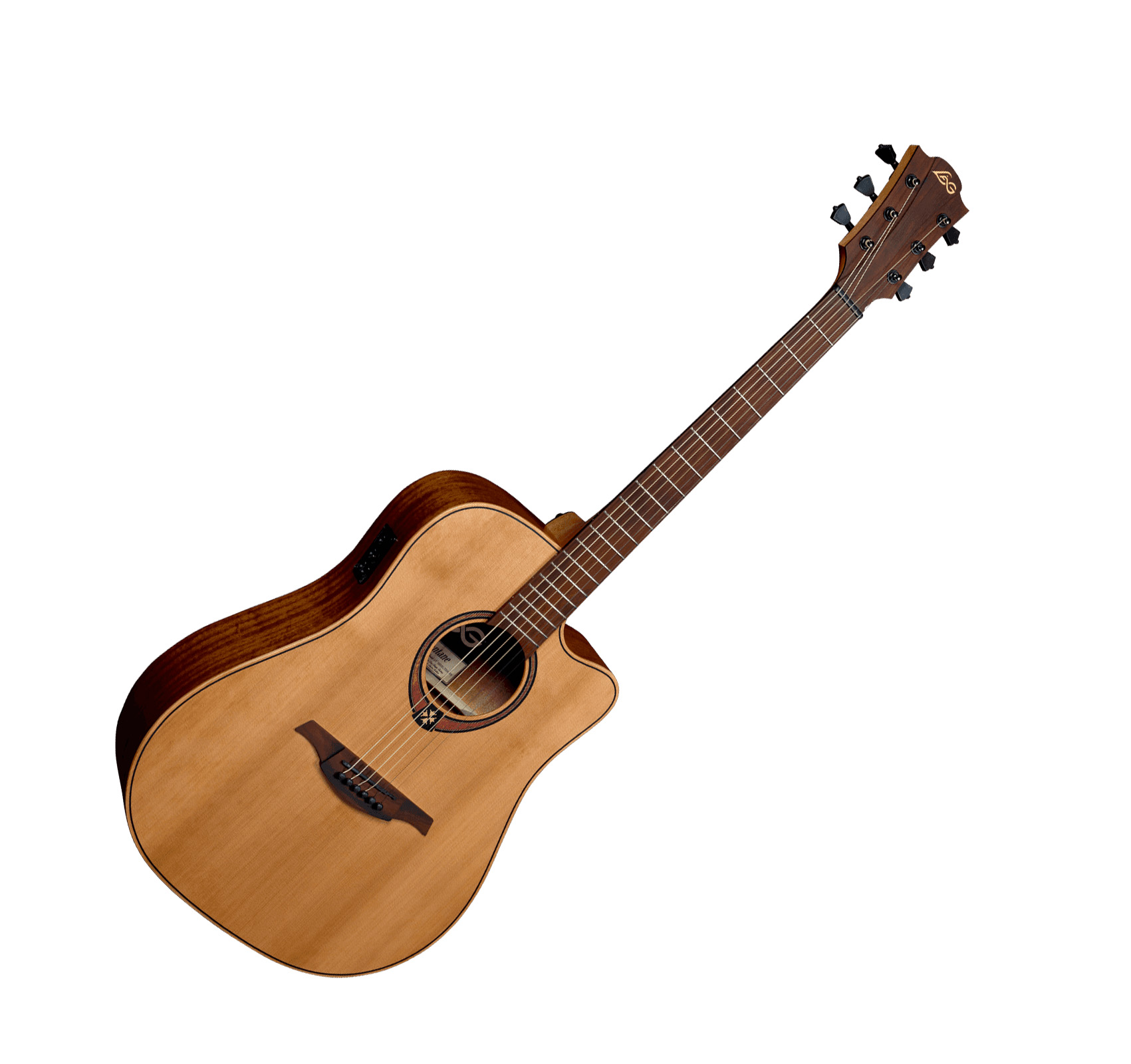 Electroacoustic guitar with dreadnought cutaway body shape from Tramontane series that features a solid Red cedar top and tropical khaya back and sides in satin finish.