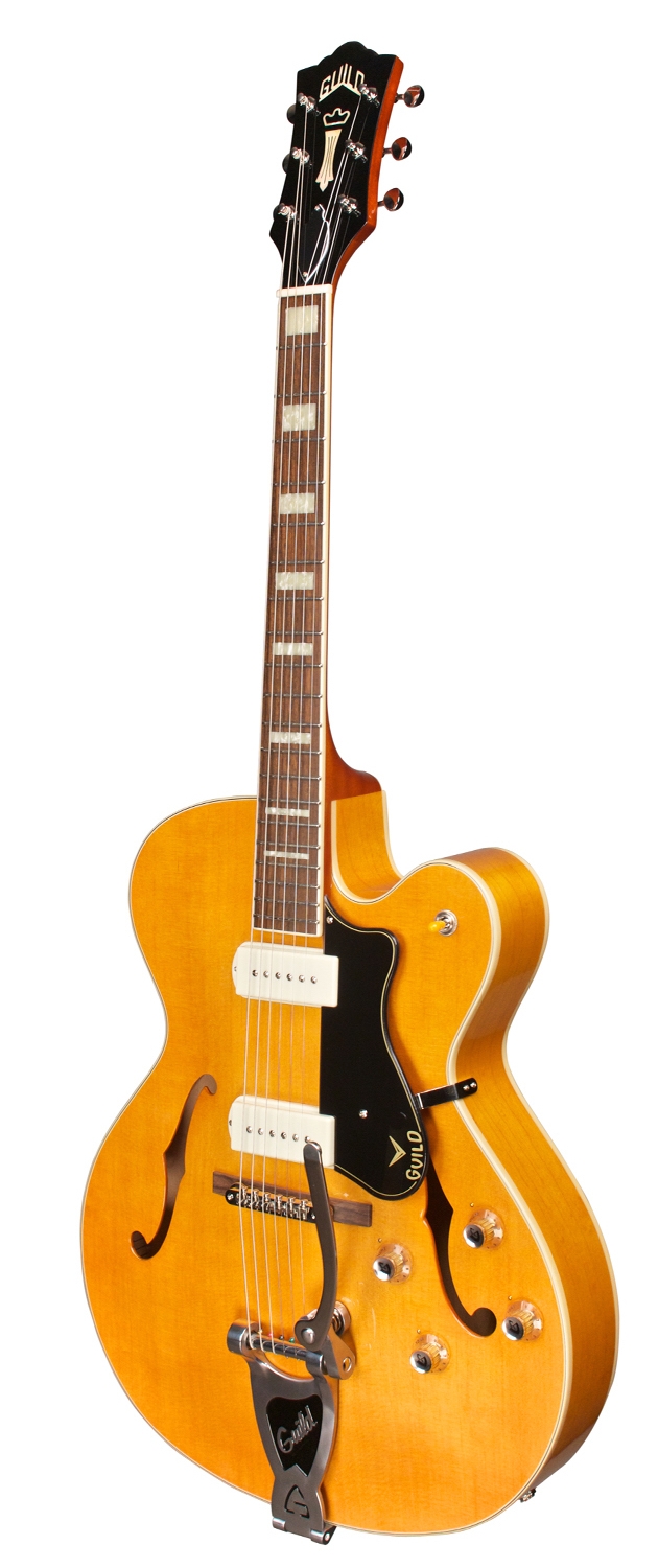 Hollow body. An extraordinary instrument for the swinging soloist and technician, Guild’s X-175B Manhattan is a masterpiece of the guitar maker’s art. It presents the same exceptional appointments as its brother, the X-175 Manhattan, including a gracefully sculpted hollow body, rock-solid three-piece neck and electrifying dual single-coil Franz P90 Dog Ear pickups, but also features the addition of a Guild vibrato tailpiece and is available in a handsome blonde finish.