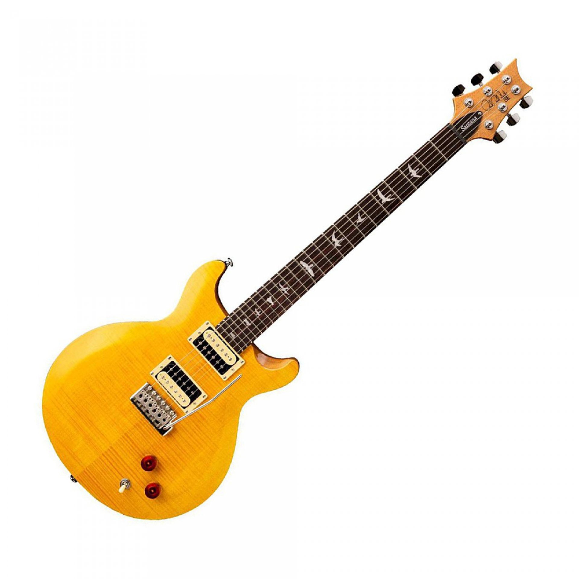 SE SANTANA 2018 electric guitar, with two PRS-SE Santana double coil magnets, Flamed Maple top, Mahogany body and neck, Wide Fat glued arm (neck set), Rosewood fingerboard with Bird Inlays, Santana Yellow color, PRS-Designed Tuners & Tremolo (bridge & keys).