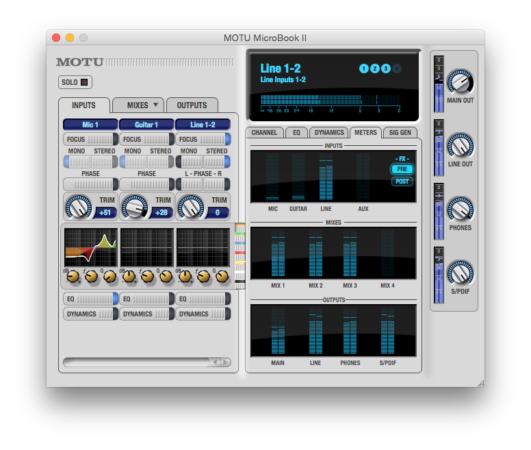- Top panel: 2 x 3-segment ladder LEDs • main outs , 1 x 4-segment LEDs • mic in , 1 x 4-segment LEDs • guitar in , 1 x 3-segment LEDs • line in , 1 x 3-segment LEDs • line out , 1 x LED • 48V phantom power , 1 x LED • -20 dB pad , 2 x LEDs • main/phone vol , 1 x digital rotary encoder • mic trim , 1 x digital rotary encoder • main/phone volume