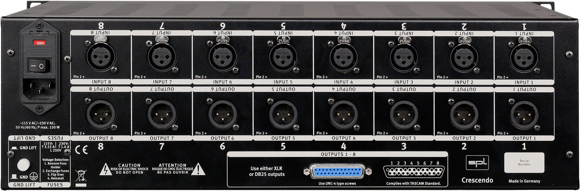 Thanks to the discrete buildup with our proprietary high-voltage amplifiers, the SPL SUPRA op-amps, and thus a possible internal operating voltage of +/- 60V (120V Technology), the Crescendo provides unprecedented technical performance data.
