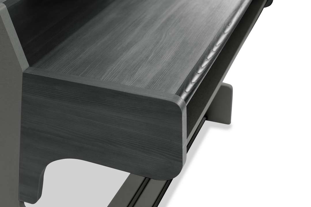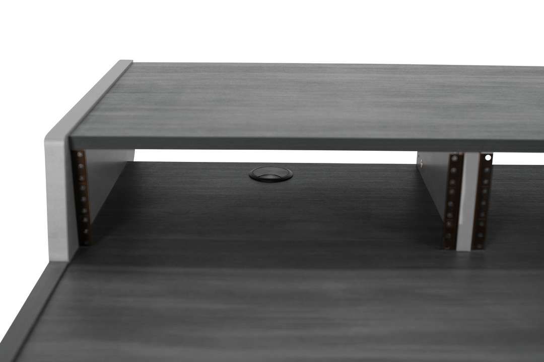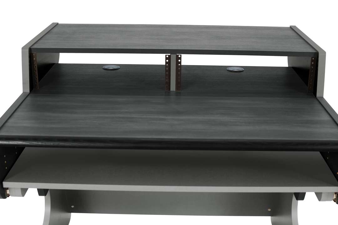 The pull-out keyboard tray can be adjusted to six different heights and holds a 49 key instrument. Above the keyboard tray is the desk surface with room for keyboard and mouse and other desktop peripherals from small mixers to controllers. On top of the space, two rack units invite you to set up your 19-inch gear from sound expanders to preamps to monitor controllers. And if you do not require any rackspace, just leave out the rack rails and use the continued desk space to your liking.