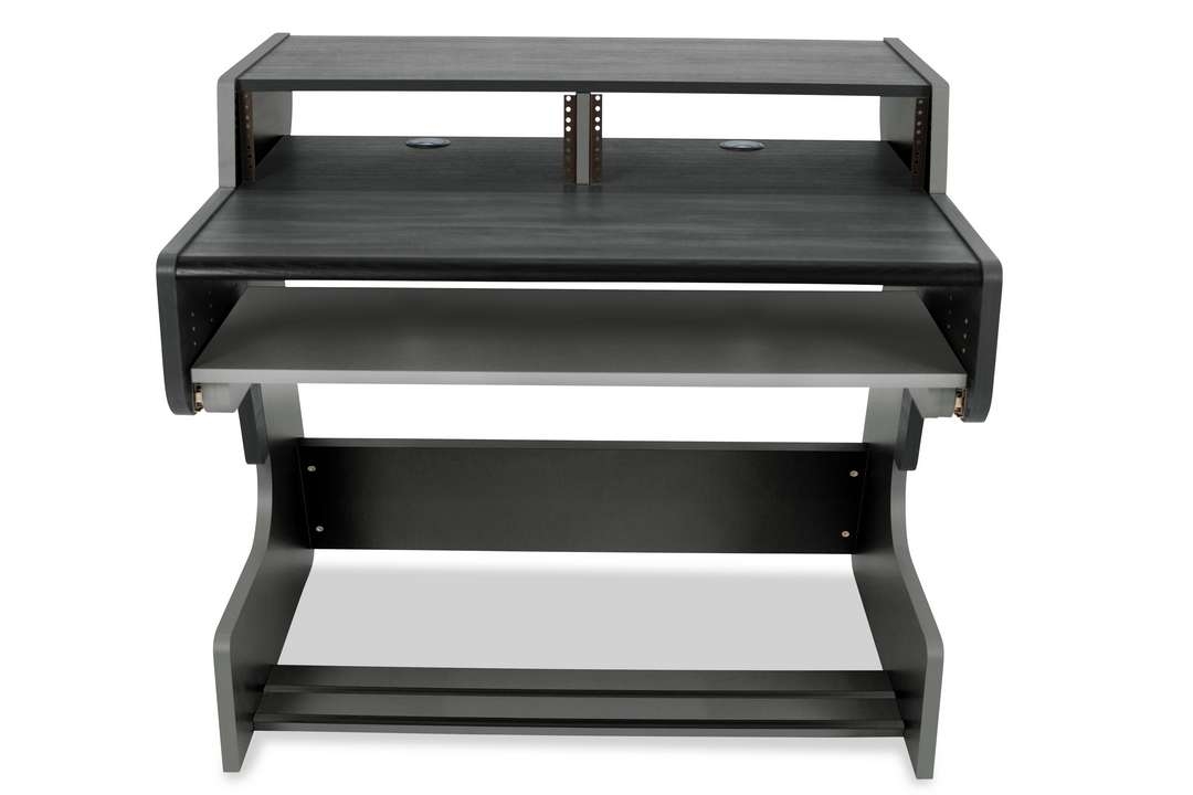 The desk is designed for the computer musician: a compact, height-adjustable keyboard tray, six rack units, and plenty of space for screens and periphery.