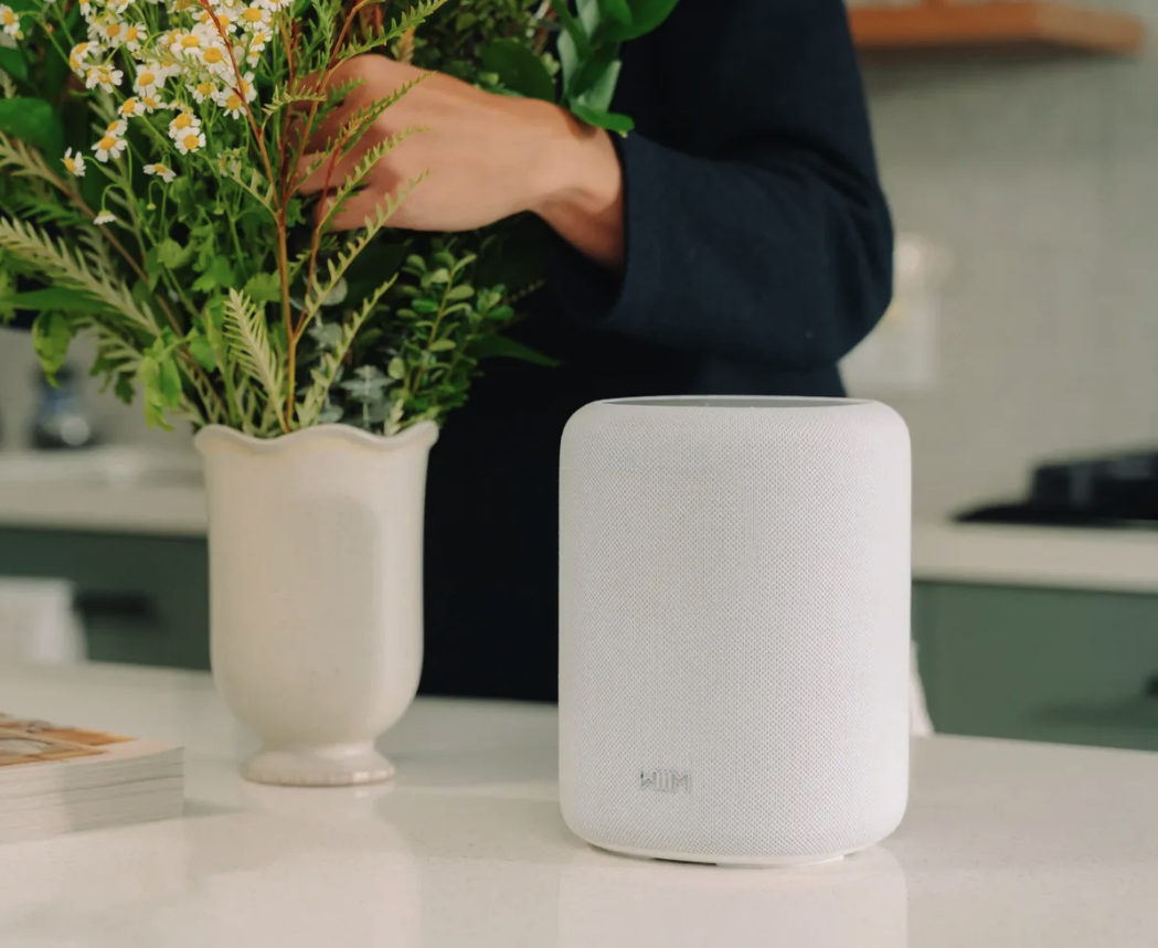 The WiiM Sound Lite smart speaker blends seamlessly into a bedroom, living room, or kitchen thanks to its elegant design and refined finish. This compact model boasts a beautiful woven fabric covering. The top of the speaker, which houses the touch controls (play/pause, volume, and track selection), is covered with a layer of tempered glass. As such, the WiiM Sound Lite sits naturally on a piece of furniture, next to the TV, on the kitchen counter, or on a bedside table.