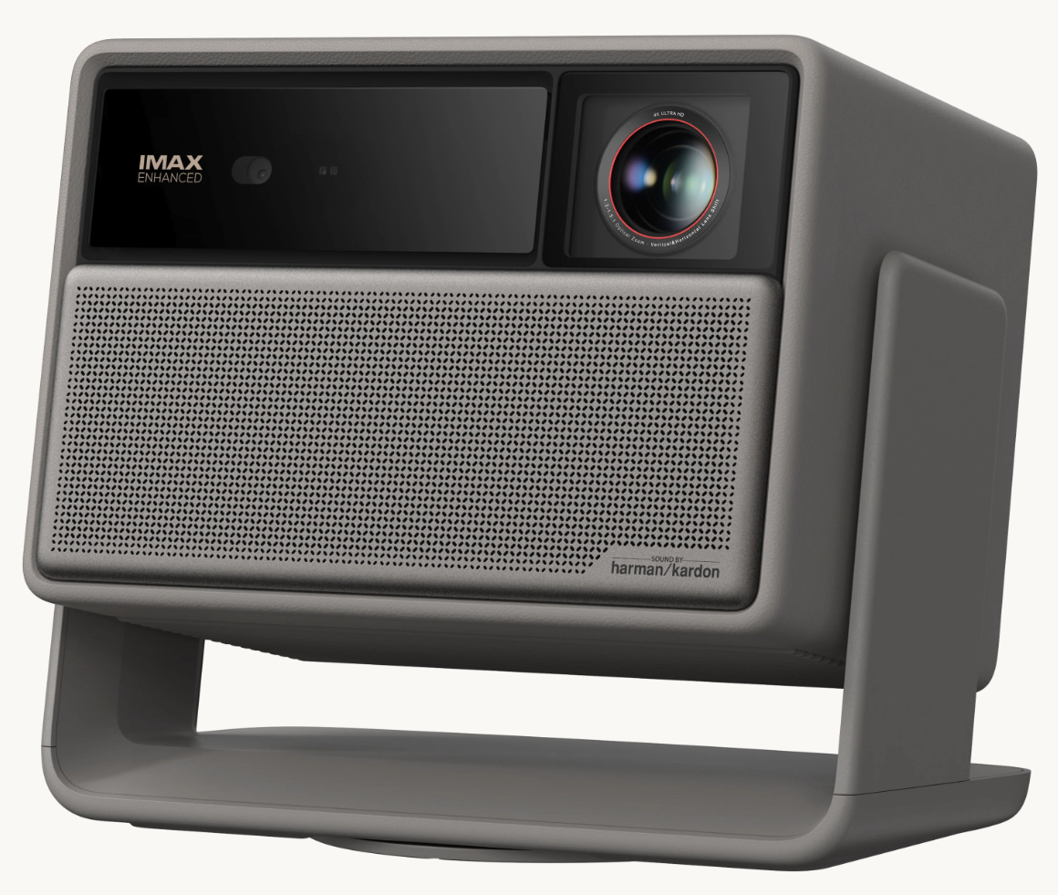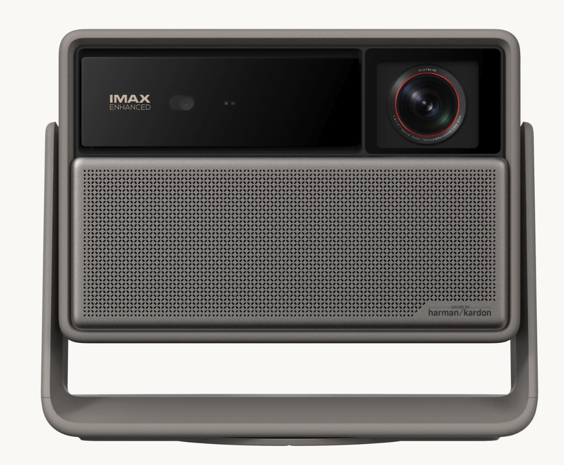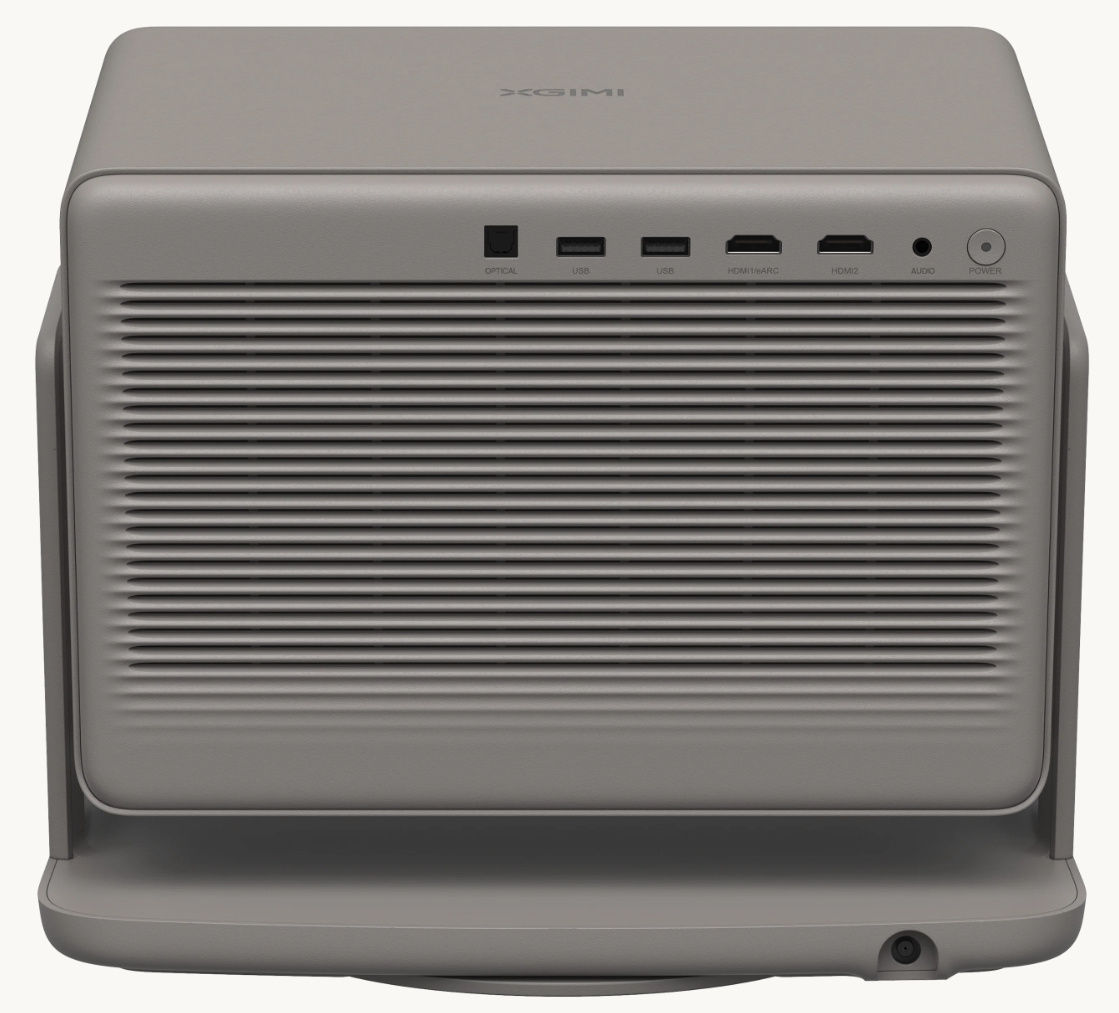 The Horizon 20 Max features a refined “Elephant Gray” finish, enhanced with a leather-like texture that gives it a distinctive visual presence. With its compact dimensions and weight of 5.4 kg, the device remains relatively compact for a projector of this power. The integrated base allows for full 360° horizontal rotation and 135° vertical adjustment, offering remarkable positioning flexibility.