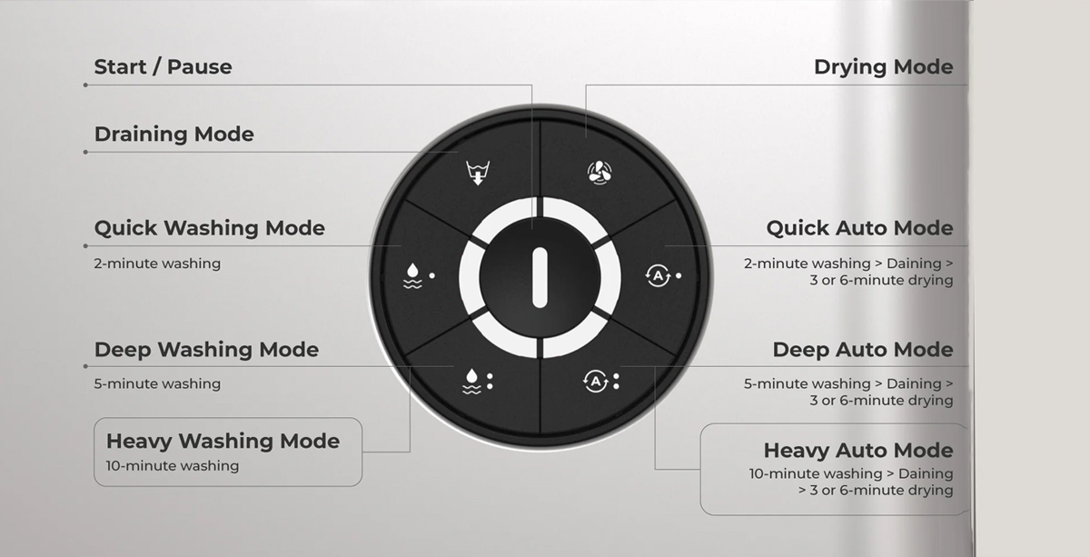 HumminGuru NOVA features six buttons, representing 4 different modes: Auto mode, Washing mode, Draining mode, and Drying mode.